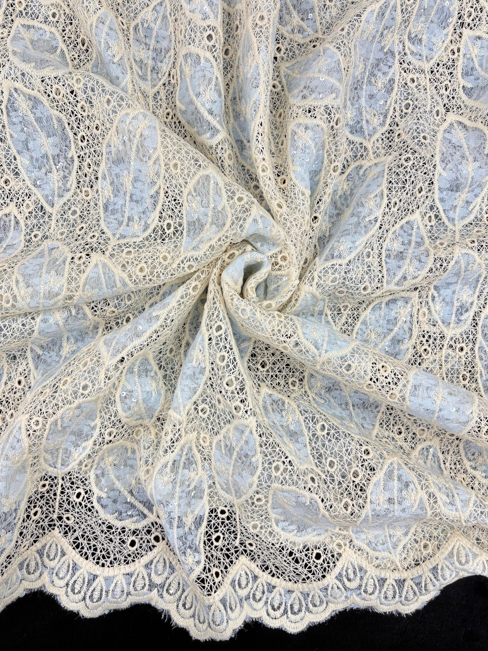 Features: Scalloped Border, Transparent Sequins, Leaf Motifs, Lightweight Net