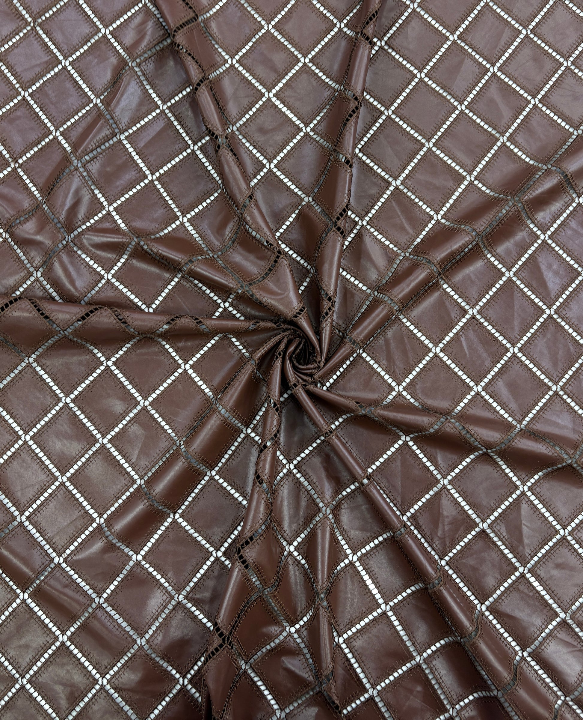 Add a bold, designer edge to your creations with this geometric PU cutwork fabric, crafted with precision laser-cut squares and a sleek faux-leather finish. The structured pattern gives a strong architectural look while the cutwork adds airflow, flexibility, and a luxe, high-fashion feel.