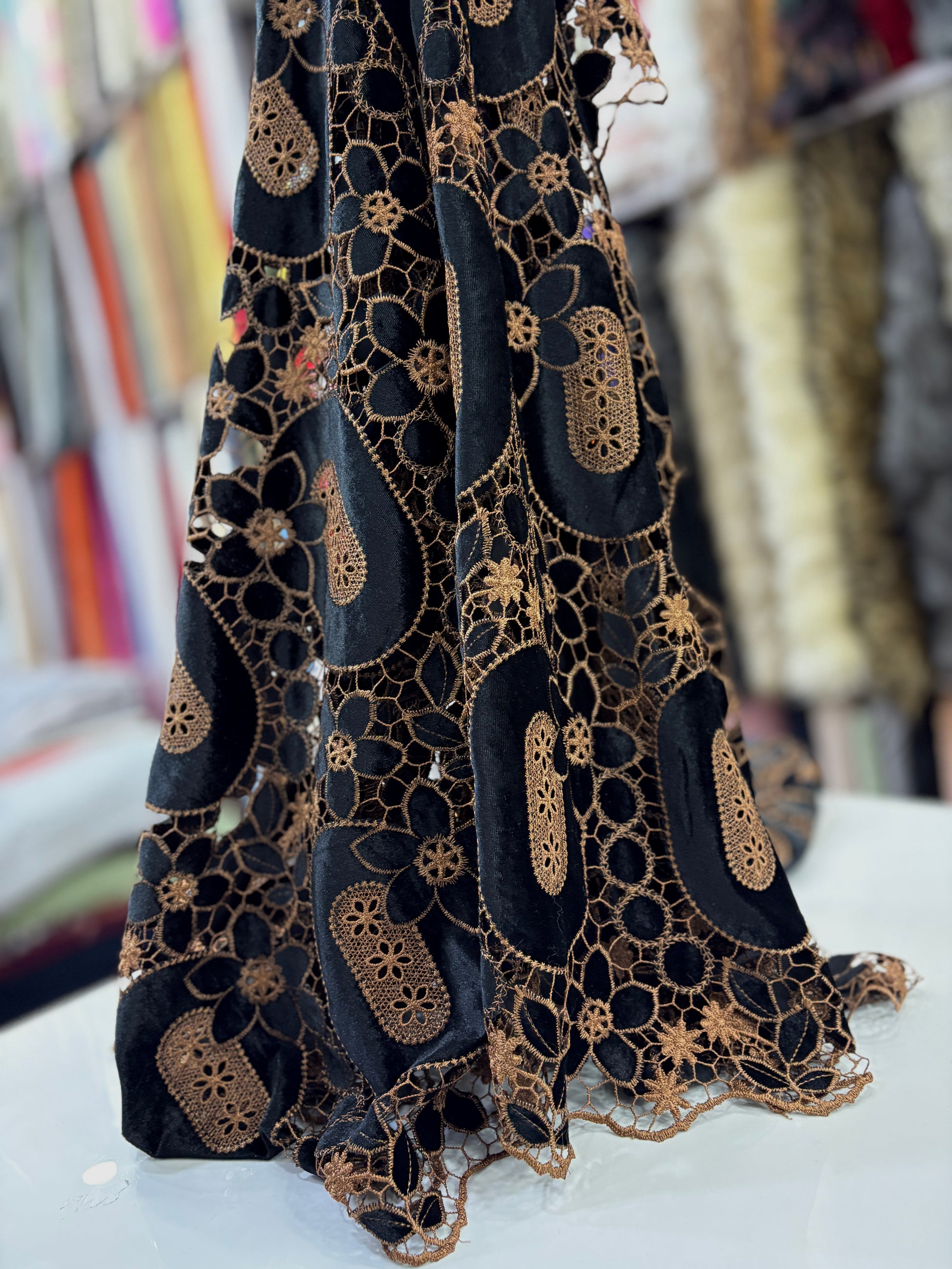 This fabric blends the richness of velvet with the elegance of cutwork embroidery, making it ideal for weddings, festive occasions, receptions, and luxury evening wear. It creates stunning, premium-looking outfits with minimal effort.